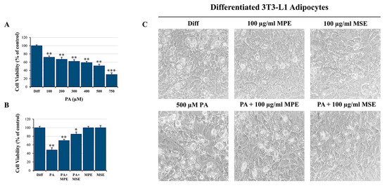 2.1. MPE and MSE Reduce PA-Induced Toxicity in 3T3-L1 Adipocytes