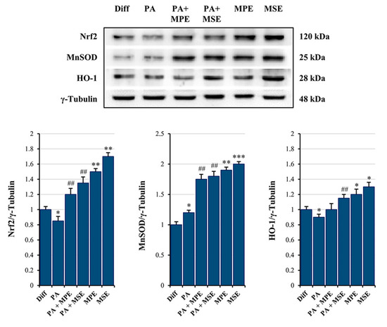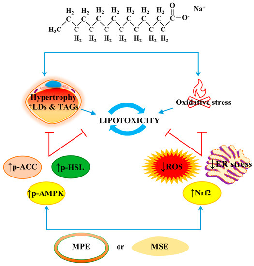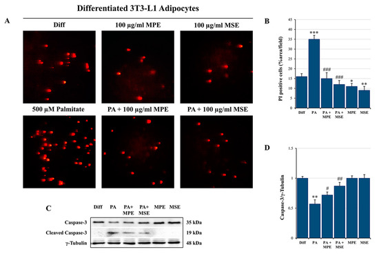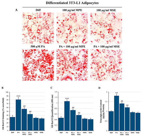2.2. MPE and MSE Reduce Lipid Accumulation in Adipocytes Exposed to High Doses of PA
