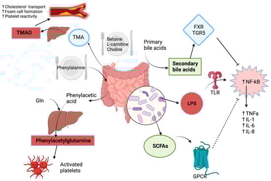 Similar to TMAO, LPS are endotoxins found on the outer membrane of Gram-negative bacteria and are involved in the pathogenesis of ASCVD. LPS are recognized by the innate immune system by toll-like receptor 4 (TLR4), which is a subtype of pattern recognition receptors (PRR) [20]. Upon recognition of LPS, TLR4 induces a pro-inflammatory state with an increased production and secretion of cytokines and chemokines [21]. LPS are also identified by other receptors, such as LPS-binding protein (LBP), myeloid differentiation protein 2 (MD-2), and cluster of differentiation 14 (CD14) [22]. These receptors, which are mainly expressed on macrophages, activate and enhance several protein kinases, such as IL-1 receptor-associated kinase (IRAK-1) and myeloid differentiation factor 88 (MyD88). NF-κB is subsequently activated, which, along with LPS, stimulate numerous pro-atherosclerotic inflammatory pathways [23,24,25]. In fact, LPS induce endothelial dysfunction, increase oxidative stress through production of reactive oxygen species (ROS), and produce several pro-inflammatory cytokines, such as TNF-α, interleukin-1 (IL-1), interleukin-6 (IL-6), and interleukin-8 (IL-8) [26,27,28]. Therefore, LPS contribute to ASCVD by promoting inflammation through various pathways.