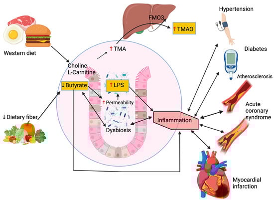 Recent studies in mice have suggested an important role of the gut microbiota in converting dietary phosphatidylcholine to TMA, which is then oxidized in the liver to TMAO [8,149]. TMAO is a pro-atherosclerotic molecule, with patients suffering from ASCVD displaying significantly higher levels of TMAO as compared with healthy individuals [149]. Several experiments have demonstrated that TMAO was involved in all steps leading to atherogenesis, specifically foam cells’ formations, endothelial dysfunction, thrombus generation, and plaque instability leading, ultimately, to plaque rupture and acute coronary syndrome [8,65,66,150].
