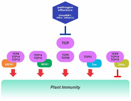 In addition to regulating developmental processes, accumulating experimental evidence indicates that TCPs play key functions in plant immunity against pathogens from different kingdoms of life and through different signaling networks. TCPs are involved in the effector-triggered immunity (ETI) activated by the pathogenic bacterium Pseudomonas syringae in Arabidopsis [91,107,108,109] and a subset of class I TCPs have been shown to interact with the negative regulator of ETI SUPPRESSOR OF rps4-RLD1 (SRFR1), facilitating plant disease resistance [91]. Moreover, TCP15 and its homologues interact with MODIFIER OF snc1-1 (MOS1) to modulate plant immunity via affecting the expression of immunity genes, as the plant immune receptor gene SNC1, as well as several cell-cycle genes that impact immunity [53]. TCPs also participate in governing plant immunity in response to changes in ambient temperature through the formation of complexes with HOPZ-ETI-DEFICIENT 1 (ZED1)-related kinases (ZRKs) that inhibit SNC1 transcription [110] (Figure 3, Table S1). In addition, several class I TCPs act as positive regulators of EFR (EF-Tu receptor)-dependent PAMP-triggered immunity (PTI) [93], function redundantly to establish systemic acquired resistance (SAR) [92] and constitute a regulatory node for communication between JA and salicylic acid (SA) signaling during the immune defense. For instance, TCP8 and TCP9 positively regulate the expression of ISOCHORISMATE SYNTHASE 1 (ICS1), which is responsible for pathogen-induced SA biosynthesis, upon pathogen infection [111]. Moreover, TCP8 interacts with most transcription factors involved in the regulation of ICS1, suggesting that TCP proteins may act as orchestrators to regulate the expression of ICS1 during pathogen infection. Meanwhile, TCP9 and TCP20 negatively regulate JA synthesis by directly binding to the JA biosynthesis gene LOX2 [112] and TCP14 regulates the plant immune system by repressing the JA signaling pathway [113]. In soybean and eggplant, GmTCP19-Like (GmTCP19L) and SmTCP7a modulate resistance to Phytophthora sojae [22] and R. solanacearum [114], respectively, but the molecular mechanisms involved are still unknown. A recent report indicated that TCP9 modulates root system architectural plasticity in response to infections by the endoparasitic cyst nematode Heterodera schachtii via reactive oxygen species (ROS)-mediated processes in Arabidopsis, establishing a novel tolerance mechanism that mitigates the impact of biotic stress rather than targeting the causal agent [115].