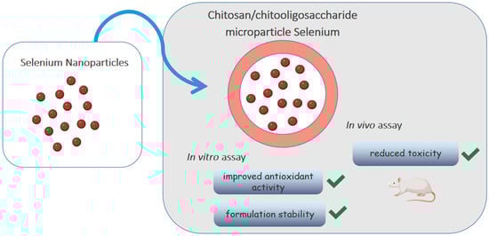 Selenium is an element that participates in important biological functions such as reducing oxidative stress. Bai et al. [68] loaded selenium nanoparticles (SE-NPs) in chitosan/chitooligosaccharides microparticles, as shown in Figure 4. Although the antioxidant activity of nanoparticles has already been described, its low stability impairs oral absorption. The in vitro release test showed that Se-NPs were released from intact microparticles, without changing morphology and size, and remained stable at 4 °C for a month, without deposition. The antioxidant activity was evaluated by the DPPH· radical and ·O2− radical anion scavenging activity assays, using vitamin C as a standard. Although the antioxidant capacity of microparticles was lower than that of vitamin C (1/10 by the former assay and 1/6 by the latter), it was still considered acceptable being much larger than that of sodium selenite. The in vivo toxicity test with Kunming mice allowed to determine an average lethal dose (LD50) of microparticles about 20 times higher than that of selenite, showing that the incorporation of Se-NPs into polymeric microparticles improved antioxidant activity, significantly reduced toxicity and increased the formulation stability.