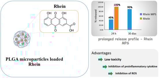 Diacerein is an anthraquinone derivative with anti-inflammatory properties able to inhibit IL-1β cytokine actions, including in cartilaginous cells, but its low water solubility causes low bioavailability. For this reason, Gómez-Gaete et al. [75] proposed PLGA microparticles loaded with rhein, the active principle of diacerein, for intra-articular administration and osteoarthritis treatment. The formulation exhibited prolonged release profile, with 45% of the drug released in 24 h and 90% in 30 days, while the cell viability test showed low toxicity. The inhibition of proinflammatory cytokine IL-1β and ROS, which are related to the activation of some inflammatory pathways, was significant compared to those of control and empty microparticles. The results as a whole showed a prolonged release formulation that would allow to reduce the number of administrations, which is a very desired feature, considering that these diseases are chronic and their treatment is prolonged. Figure 5 shows some of the benefits of rhein due to the formation of microparticles.