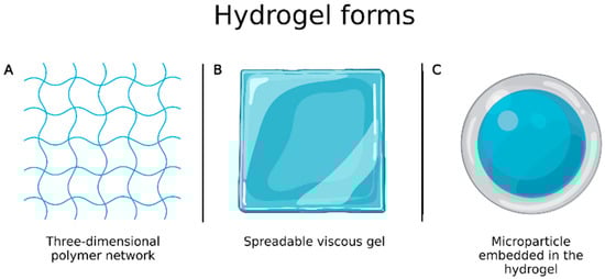 (A) Hydrogel in the form of three-dimensional polymer network; (B) hydrogel in the form of spreadable gel; (C) microparticle embedded in the hydrogel. Created with Biorender.com. accessed on 20 March 2022.