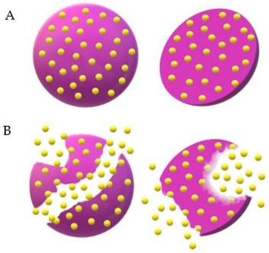 Structurally, microparticles are divided into two large groups, that is, microspheres, in which the active compound and the raw material are dispersed or dissolved homogeneously, and microcapsules, in which there is a membrane enclosure delimiting and encompassing the nucleus—solid, liquid or gaseous—where the active principle is deposited [3,9]. Other variants of microparticles can be manufactured with different multilayers, nuclei or irregular shapes (Figure 1) [10].