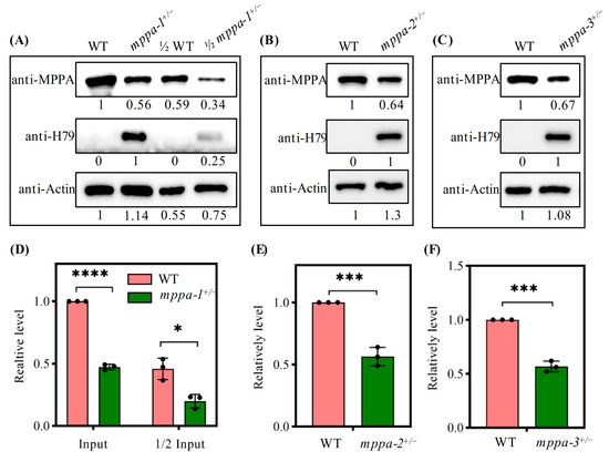 | mppa-1+/− × WT | WT: mppa-1+/− = 39:41 | 0.05 * |