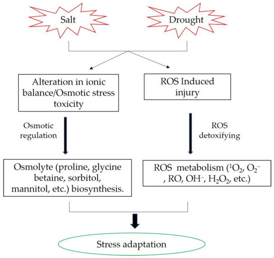 The molecular and physiological mechanisms of plants’ responses to drought and salt stress exhibit similarities. Salt stress can cause ion and metabolic imbalance due to plant ion toxicity. Another salinity component is high osmotic stress, which leads to a water deficit similar to that caused by drought stress. Plants generally counteract the negative effects of salinity and drought by activating biochemical reactions, such as osmolytes synthesis and accumulation, intracellular ion homeostasis maintenance, and reactive oxygen species scavenging (Figure 1) [79,80]. Osmolytes performs important roles in plant response to abiotic stress. Enhancing the biosynthesis of trehalose can increase yield potential in marker-free transgenic rice under drought and salt conditions [81]. Heat shock proteins (Hsps) were also involved in osmotic adjustment. Overexpression of OsHsp17.0 and OsHsp23.7 enhances drought and salt tolerance in rice [82]. A novel C2H2 zinc finger transcription factor, DST (drought and salt tolerance), that controls stomatal aperture under drought and salt stress in rice. DST contributes to stomata movement via regulation of genes involved in ROS homeostasis [71]. OsRLCK241 improved salt and drought tolerance in rice is mainly due to improved ROS detoxification, increased accumulation of osmolytes, and altered expression of stress-responsive genes [83].