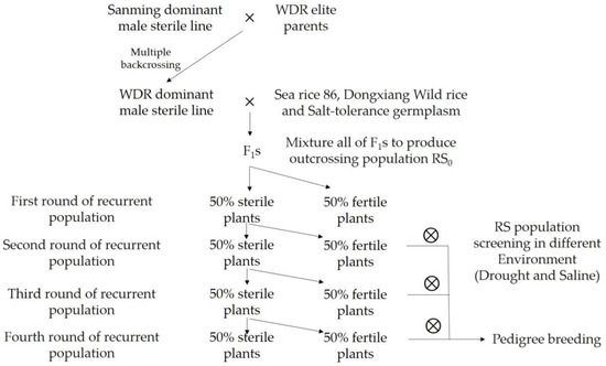 Here, we introduce a method for breeding salt-tolerant and WDR varieties using populations developed by recurrent selection based on dominant genic male sterility lines (Figure 2). Recurrent selection involving dozens of parents and multiple cycle of trait selection is an effective breeding approach to simultaneously broad genetic diversity and improve the quantitative traits. Recurrent selection is a systematic population improvement method. Through “selection-recombination and reselection-recombination” cycles, the frequency of favorable genes in the population gradually increases, improving the target traits in the population. The advantages of recurrent selection include rapid cycling and subsequent accumulation of favorable alleles from many parents into a single superior genotype and increased recombination and breaking of repulsion-phase linkages. Breeding practices in crops have shown that recurrent selection is the most effective method for population improvement and generation of germplasm with novel traits, especially for the simultaneous improvement of multiple complex agronomic traits [86].