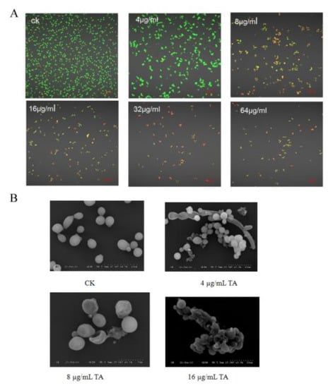 2.3. Laser Confocal and Scanning Electron Microscopy and Observation of TA-Treated C. albicans