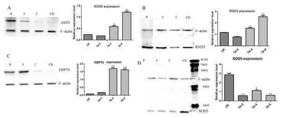 - Wang, H.B.; Liu, D.C.; Sun, T.T.; Zhang, A.M. Asparagine synthetase gene TaASN1 from wheat is up-regulated by salt stress, osmotic stress and ABA. J. Plant Physiol. 2005, 162, 81–89. [Google Scholar] [CrossRef]