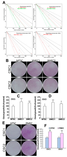 PTC tumor stromal cells enhanced CSC self-renewal and clonal growth. (A) Tumor stromal cell increased CSC sphere-formation efficiencies in transwell cocultures as the stromal cells isolated from either patient-derived xenograft tumors (top panel) or patient primary tumors (bottom panel). (B–F) Tumor stromal cells enhanced CSC clonal growth in transwell cocultures as the stromal cells isolated from either patient-derived xenograft tumors (B–D) or patient primary tumors (E,F). Data are representative of at least three independent experiments and shown as mean ± SEM. Mouse normal thyroid stromal cell culture (MTSC), xenograft tumor microenvironment stromal cell culture (XMEC), patient non-tumor thyroid stromal cell culture (HTSC), patient primary tumor microenvironment stromal cell culture (PMEC); * p < 0.05, ** p < 0.01, *** p < 0.001.