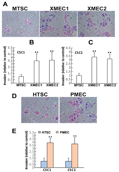 PTC tumor stromal cells enhanced CSC invasiveness. (A) Patient-derived xenograft tumor stromal cells increased CSC1 invasive activities in Boyden chamber invasion assays. (B,C) Quantitative analyses showed different xenograft tumor stromal cells having the capacity to enhance both CSC1 and CSC2 cell invasion. (D) Patient primary tumor stromal cells increased CSC1 cell invasive activities. (E) Quantitative analyses revealed patient primary tumor stromal cells having the capacity to enhance both CSC1 and CSC2 cell invasion. Data are representative of at least three independent experiments and shown as mean ± SEM. Mouse normal thyroid stromal cell culture (MTSC), xenograft tumor microenvironment stromal cell culture (XMEC), patient non-tumor thyroid stromal cell culture (HTSC), patient primary tumor microenvironment stromal cell culture (PMEC); ** p < 0.01. Scale bars: 100 µm.