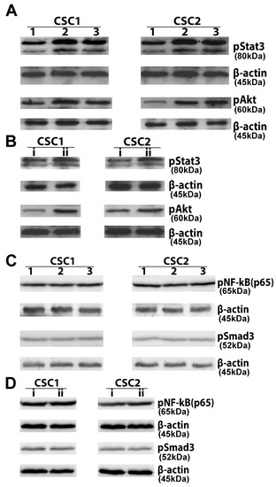 The above observations revealed the capacity of tumor stromal cells to affect CSC behaviors. We next examined the potential signaling pathways that might mediate the effects of tumor stromal cells on CSCs. According to the findings in recent studies, there are several signaling pathways, including JAK/STAT [59,60,61,62,63], PI3K/Akt [64,65,66,67,68,69,70], NF-kB [71,72,73,74,75,76], and TGF-β signaling [77,78,79,80,81,82,83], that could possibly be mediating the stromal cell functioning in PTC, as these signaling pathways have been found to be involved in the effects of stromal cells on tumor cells [59,60,61,62,63,77,78,79,80,81,82,83]. To unveil the potentially engaged signaling pathways, we examined the expression of specific molecules that indicate different signaling pathway activities with Western blotting analyses. It was observed that phosphorylated (activated) STAT3 expression, the indication of JAK/STAT3 signaling activity, was elevated in the CSCs when the cells were transwell cocultured with PDX tumor stromal cells in comparation with mouse normal thyroid tissue stromal cells (Figure 3A). In addition, transwell coculture with patient primary tumor stromal cells similarly increased the pSTAT3 expression in CSCs compared to the coculture with patient non-tumor thyroid tissue stromal cells (Figure 3B). It was also revealed that the expression of phosphorylated Akt, an indication of the PI3K/Akt pathway activity, was increased in CSCs that were transwell cocultured with PDX or patient primary tumor stromal cells as compared with the controls in which the CSCs were transwell cocultured with mouse normal thyroid or patient non-tumor thyroid tissue-derived stromal cells, respectively (Figure 3A,B). In contrast, the expression levels of pNF-kB (NF-kB signaling activity indicator) and pSmad3 (TGF-β signaling activity indicator) were not altered in the CSCs that were transwell cocultured with PDX or patient primary tumor stromal cells as compared with the respective controls (Figure 3C,D). Altogether, these observations demonstrated the capacity of tumor stromal cells to enhance JAK/STAT3 and PI3K/Akt signaling in CSCs, suggesting that JAK/STAT3 and PI3K/Akt signaling pathways might be engaged in the functioning of tumor stromal cells on PTC CSCs, while NF-kB and TGF-β signaling were unlikely to have contributed to the tumor stromal cells’ effect, as shown in Figure 1 and Figure 2, on PTC CSCs.