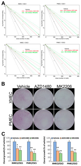 2.3. PI3K/Akt and JAK/STAT3 Signaling Engaged in the Promoting Effect of Tumor Stromal Cells on CSC Sphere Formation and Clonal Growth
