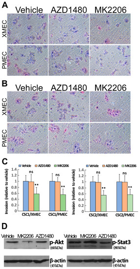 To validate that AZD1480′s inability to influence CSC invasion was not an artifact derived from the inadequate blockade of JAK/STAT3 signaling activity, we analyzed the pAkt and pSTAT3 expression in the MK2206, AZD1480 and vehicle-treated CSCs within the invasion assays by Western blotting. It was found that MK2206 and AZD1480 treatment effectively reduced CSC pAkt and pSTAT3 expression, respectively, within the invasion assays that were involved in either PDX or patient primary tumor stromal cells (Figure 5D). Similar profiles of pAkt and pSTAT3 expression were obtained when another two different CSC samples were subjected to the invasion analyses. Altogether, the above data demonstrated that PI3K/Akt signaling contributed to the tumor stromal-cell-induced enhancement of PTC CSC invasion, while the JAK/STAT3 signaling was not relevant to the invasion enhancement.