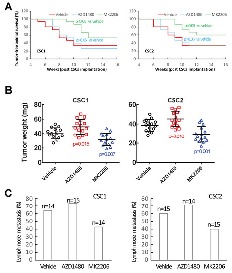 Inhibition of PI3K/Akt signaling reduced CSC tumorigenesis and tumor progression. (A) MS2206 treatment decreased CSC tumor formation efficiency compared with vehicle and AZD1480 treatment in subcutaneous xenograft tumor models. (B,C) MS2206 treatment reduced PTC tumor growth (B) and lymph node metastasis (C) compared with vehicle and AZD1480 treatment in orthotopic xenograft tumor models.
