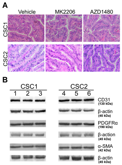 Next, we wanted to assess whether PI3K/Akt and JAK/STAT3 signaling inhibition could function as potential treatments targeting PTC tumor progression. To this end, we established an orthotopic xenograft tumor model by implanting CSCs into the right thyroid of NOD/SCID mice. Four weeks after the implantation, which allowed the orthotopic tumor formation [53], the tumor-bearing animals began receiving either MK2206, AZD1480 or vehicle treatment. Upon completion of the treatments, animals were evaluated for signs of orthotopic primary tumors. The MK2206 treatment significantly reduced the orthotopic tumor volumes compared to the vehicle treatment (Figure 6B). Interestingly, the AZD1480 treatment increased the tumor volumes in comparison with both the vehicle and the MK2206 treatment (Figure 6B). These results were reproducible in three different CSC-sample-derived orthotopic tumors (Figure 6B, Supplementary Figure S3B), suggesting that the PI3K/Akt and the JAK/STAT3 signaling played different roles in the process of PTC tumor development. To further explore possible differences between the inhibition of PI3K/Akt and JAK/STAT3 signaling, we examined the cervical lymph nodes of the treated animals for potential signs of metastasis. Inhibiting PI3K/Akt signaling resulted in fewer animals with lymph node metastasis compared with the vehicle treatment (Figure 6C, Supplementary Figure S3B). Among the animals that had developed lymph node metastasis, fewer metastatic nodes were found in the MK2206-treated mice (1–2 nodes/mouse) compared with the vehicle-treated ones (2–3 nodes/mouse; MK2206 vs. vehicle, p < 0.05). In contrast, inhibiting JAK/STAT3 signaling as treatment ended with more animals having lymph node metastasis in comparison with the inhibition of PI3K/Akt signaling and the vehicle treatment (Figure 6C, Supplementary Figure S3B). There were no significant differences observed in the metastatic lymph node numbers among the animals that received either AZD1480 or vehicle treatment. Furthermore, we investigated whether the PI3K/Akt and JAK/STAT3 signaling inhibition had any influence on tumor histological features. It was found that tumors from the MK2206, AZD1480 and vehicle treated animals showed comparable histology (Figure 7A). In addition, Western blotting analysis of tumor tissues for vasculature marker CD31 expression did not identify differences among the different treatment groups (Figure 7B). Similarly, the TME fibroblast markers, PDGFR⍺ and ⍺-SMA [84,85], showed comparable expression levels between the tumors that received different treatments (Figure 7B). Altogether, the above results demonstrated that inhibiting PI3K/Akt signaling had therapeutic benefits on PTC primary tumor development and metastasis formation, while inhibiting JAK/STAT3 signaling had no beneficial effects on both the primary tumors and the metastases in an orthotopic xenograft model. In addition, no alterations in tumor vasculature, histology and cancer associated fibroblast cell population were identified after the disruptions of the two respective signaling pathways.