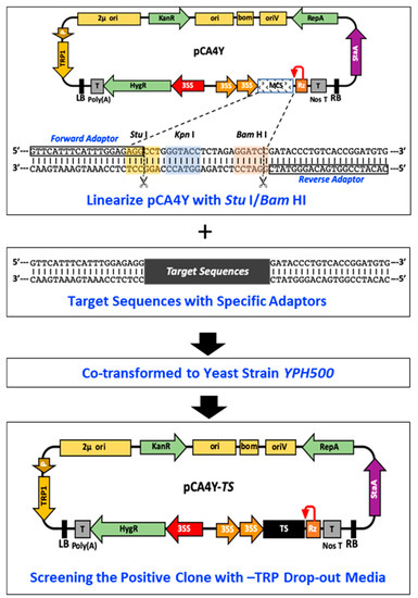 Taking advantage of the pCA4Y vector, we established a detailed large and multiple DNA HR-based cloning method in yeast using endogenous recombinase (Figure 2). The detailed operation procedures are illustrated. First, we linearized the vector using the existing Stu I/Bam HI endonuclease. Specific primer pairs were designed with a forward adaptor and reverse adaptor (Figure 2), and the target DNA fragment was then amplified using the designed primers. Moreover, the target DNA fragment and linearized vector were mixed at a molar ratio (2:1) and co-transformed into the yeast strain YPH500. The positive transformants grew well in a tryptophan drop-out medium with kanamycin resistance.