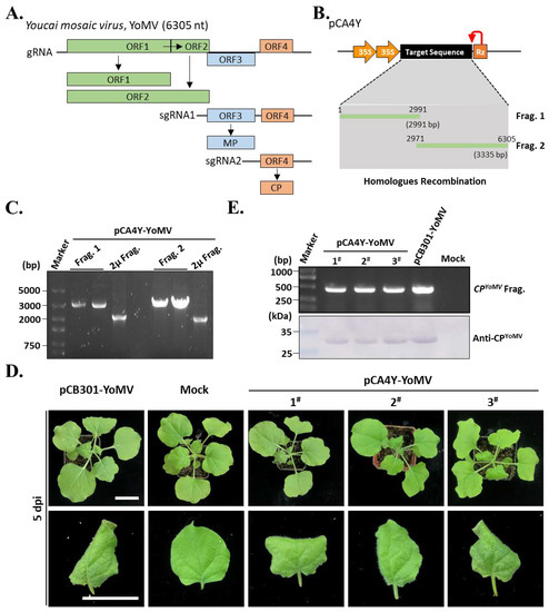 To further validate whether the developed yeast HR-based cloning method could be used for cDNA infectious clone construction of other positive plant viruses, we selected YoMV isolated from the R. sativus planted in Henan Province. The YoMV genome is a single positive-strand RNA of approximately 6.3 kilo-nucleotides in length (Figure 4A), which is hard to clone using the traditional molecular cloning method by the endonuclease. Hence, we divided the genome sequence into two fragments and amplified respective cDNAs by RT-PCR from the total cDNAs of R. glutinosa. These two fragments were 2991 and 3335 bp in length, respectively (Figure 4B). Similarly, we mixed fragments 1 and 2 with the linearized pCA4Y vector and co-transformed it with yeast YHP500. PCR amplification of the yeast 2 μ fragment, viral fragment 1, and fragment 2 was performed to validate the effectiveness of HR-based cloning using the developed method in yeast (Figure 4C). The results showed that the pCA4Y-YoMV plasmid was successfully constructed (Figure 4C). Furthermore, we transformed the positive pCA4Y-YoMV plasmid into Agrobacterium tumefaciens strain GV3101 and inoculated the obtained positive clone into N. benthamiana. After 5 dpi, yellowing, rolling, mosaic, and slight necrosis appeared on the upper leaves of the inoculated plants, similar to the pCB301-YoMV-positive Agrobacterium-inoculated plants (positive control) (Figure 4D), the pCB301-YoMV vector was granted by Dr. Zhenggang Li (Guangdong Academy of Agricultural Sciences, Guangzhou, China) [16]. These results indicated that yeast HR-based YoMV infectious cDNA construction was successful. Moreover, we collected the upper symptomatic leaves and performed Western blotting and RT-PCR using YoMV coat protein-specific antibodies and CP gene-specific primers, respectively. The results showed that all pCA4Y-YoMV-positive Agrobacterium-inoculated plants were infected by YoMV, as well as the positive control (Figure 4E). In summary, these results demonstrated that the yeast HR-based YoMV infectious cDNA construction was effective and successful, and the constructed pCA4Y could be used for the efficient construction of positive single-strand plant virus cDNA clones.