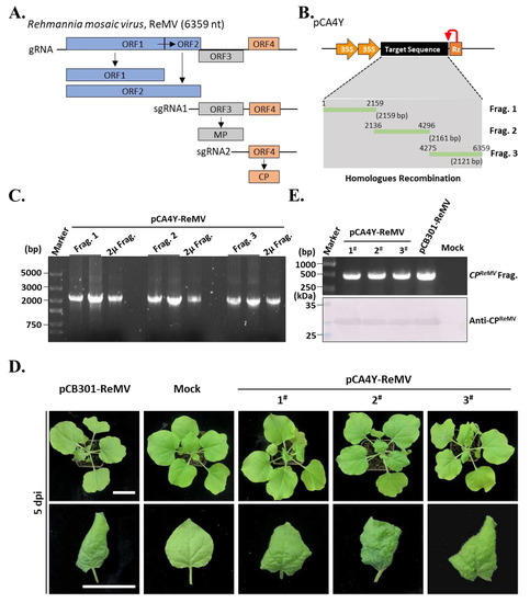 To further test the efficiency of the yeast HR-based construction of plant virus cDNA clones, ReMV was selected as the target. ReMV belongs to the same genus as YoMV and has a similar genome organization (Figure 5A). Our previous study showed that R. glutinosa collected from Henan Province in China was infected with both Cucurbit chlorotic yellow virus (CCYV) and ReMV [19]. Hence, the total cDNA of R. glutinosa used above was treated as a template, and RT-PCR was performed. Similarly, we divided the ReMV genome into three segments and designed three primer pairs. Using these primers and the total cDNA templates, we amplified cDNA fragments 1 (2159 bp), 2 (2161 bp), and 3 (2121 bp) (Figure 5B). Next, we performed yeast HR-based construction of a full-length cDNA clone of ReMV. The pCA4Y-ReMV plasmid was further validated by PCR using primers corresponding to the viral cDNA fragments 1, 2, and 3 and yeast 2 μ element. The results showed that all fragments could be amplified from the pCA4Y-ReMV plasmid, indicating that the ReMV full-length cDNA clone was successfully constructed (Figure 5B). To test whether the ReMV full-length cDNA clone was infectious in N. benthamiana, we transformed the plasmid into Agrobacterium tumefaciens strain GV3101 and inoculated the Agrobacterium into N. benthamiana by infiltration. After 5 dpi, the leaves appeared as yellowing, curling, and mosaic, even with local cell necrosis (Figure 5D), which implied that the inoculated plants were infected by ReMV. To determine whether these symptoms were caused by ReMV, upper symptomatic leaves were collected for total protein and RNA extraction. RT-PCR and Western blotting were performed using pair of primers and antibodies specific to coat protein-coding sequence and CP, respectively. (Figure 5E). The results indicated that the inoculated plants were infected with the constructed ReMV cDNA clones as well as the positive control (pCB301-ReMV), the pCB301-ReMV vector was constructed this time. Taken together, the results demonstrated that the constructed triple-shuttle plasmid pCA4Y and the developed yeast HR-based multiple fragment cloning were effective and suitable for the construction of positive single-stranded plant virus infectious cDNA.