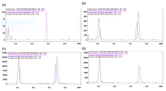 Representative MRM ion-overlay chromatograms of vitamin D2 and D3 and their 25-hydroxy metabolites extracted from DBS prepared from vitamin D free artificial blood (a) blank, and with standard spiked at LQC (b) and MQC level (c). (d) Clinical Sample(#4200007901B2) extracted from DBS.