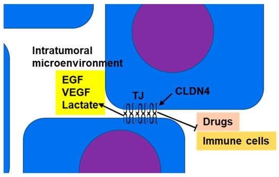 CLDN4 is a major structural protein of epithelial TJs in intestines and lungs and is involved in epithelial differentiation, polarity maintenance, and substance trafficking [,]. In normal epithelial tissue, TJs act as barriers or gates that separate the outside from the inside of the body and restrict material transport; however, in tumor tissue, the polarity of the cells and tissues is ambiguous. Thus, in CLDN4-overexpressing epithelial malignancies, the barrier function of TJs serves to maintain the tumor microenvironment and retain tumor-secreted growth factors to promote the malignant cancer phenotype (Figure 1) [,,,,]. VEGF and IL-8, cancer cell-derived angiogenic factors, are upregulated by CLDN4 and their accumulation in tumors promotes tumor angiogenesis [,]. In addition, cancer cells exhibit enhanced glycolysis (known as the Warburg effect) that results in the release of extracellular lactate []. The barrier function of CLDN4 leads to the accumulation of lactate within the tumor microenvironment and maintains an acidic environment around the cancer cells []. A decrease in extracellular pH is associated with the pH-sensitive G-protein-coupled receptors (GPCRs) GPR4, GPR65 (TDAG8), GPR68 (OGR1), and GPR132 (G2A). This acidic environment promotes the proliferation, migration, invasion, and metastasis of cancer cells. An acidic tumor microenvironment, linked with a hypoxic environment, promotes the expression of malic enzyme 1 and brings EMT to tumor cells through YAP1 activation []. An acidic environment also suppresses immune cells (allowing cancer cells to escape from cancer-targeted immunity) []. Furthermore, TJs restrict the movement of external substances into the tumor microenvironment, thus enabling cancer cell drug resistance [].