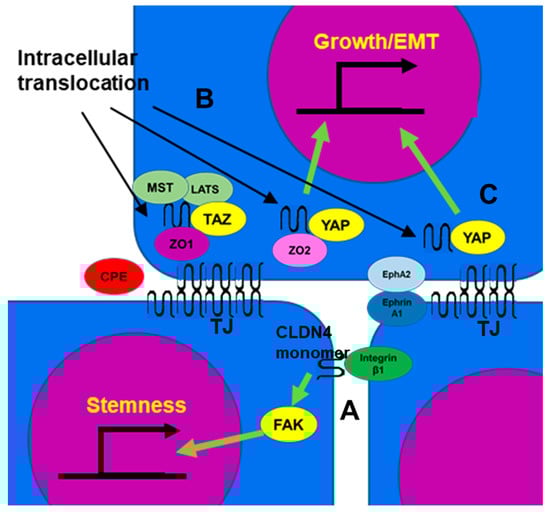 The function of non-TJ CLDN4. (A) CLDN4 monomer that does not form TJs is a binding partner for integrin β1 expressed in neighboring tumor cells, activates FAK, and promotes expression of stemness-associated genes. (B) CLDN4 translocates into the cytoplasm from TJs disrupted by CPE and forms a stable complex with TAZ, MST, LATS, and ZO1, but YAP is released from the complex and translocates into the nucleus with ZO2 to induce expression of YAP target genes, leading to proliferation and EMT. (C) EphA2 activated by Ephrin A1 expressed on the surface of neighboring cells phosphorylates CLDN4 and releases it from TJs. The released CLDN4 is translocated into the nucleus with YAP. CLDN4, claudin-4; TJ, tight junction; CPE, Clostridium perfringens enterotoxin; TAZ, tafazzin; YAP, yes-associated protein; ZO, zonula occludens; MST, mammalian Ste20-like kinase; LATS, large tumor suppressor kinase; Eph A2, ephrin type-A receptor 2; FAK, focal adhesion kinase; EMT, epithelial-mesenchymal transition.
