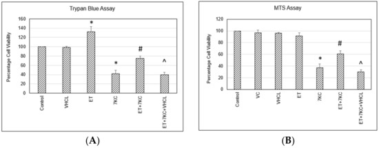 Trypan blue assay, which utilises an exclusion method, was performed to analyse the effects of 7KC and ET on the viability of cells, whereby nonviable cells take up the dye, but viable cells do not. Treated cells were detached with trypsin (0.25%) (Omega Scientific, Los Angeles, CA, USA) for 3 min before centrifugation for 5 min at 1000× g. The supernatant was discarded, and the pellet resuspended in fresh EBM-2 media, and a portion of the cell suspension was mixed 1:1 with trypan blue (0.4%) (Thermo Fisher Scientific) and loaded into cell counting chambers for analysis by an automated cell counter (TC10, Bio-Rad, Hercules, CA, USA).