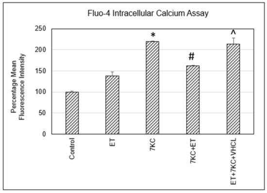 7KC induced an increase in intracellular free calcium as detected by Fluo-4 assay using flow cytometry. This increase was significantly modulated by ET. Addition of VHCL abrogated the increase in intracellular free calcium. ET: 1 mM ET; VHCL: 100 μM VHCL; 7KC: 30 μM 7KC. Data are represented as the mean ± SD (n = 6). * Significant difference compared to controls (p < 0.05). # Significant difference compared to 7KC. ^ Significant difference compared to ET + 7KC. Data were analysed by one-way ANOVA with Bonferroni’s multiple comparison post-hoc test.