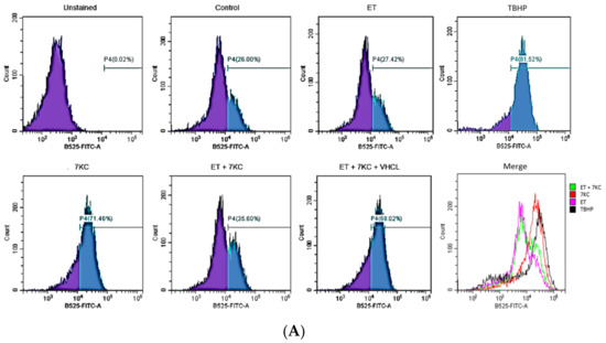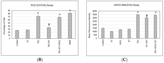 7KC appeared to induce an increase in overall ROS production in cells, as shown by DCFDA assay, which of course has some problems with specificity [27]. Positive control TBHP also induced overall ROS production in cells. The addition of ET significantly reduced the DCFDA signal from approximately 70% to 35%; however, this effect was abrogated by VHCL tert-butyl hydroperoxide (TBHP), which is a positive control for the DCFDA assay (Figure 4A). To support the DCFDA assay results and verify mitochondrial ROS (mROS) production, MitoSOX assay was used. 7KC induced a significant increase in mROS production in cells, and this increase was reduced with ET (Figure 4B).
