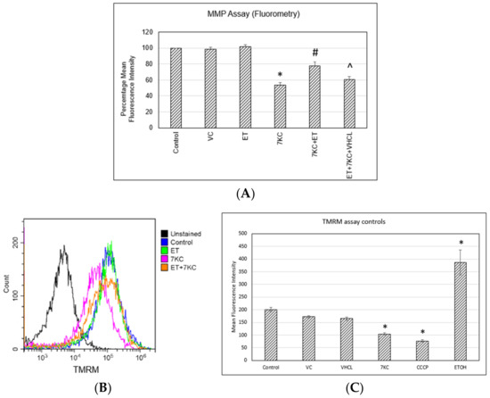 Mitochondrial membrane potential assays. 7KC was found to significantly increase the number of cells with lower mitochondrial membrane potential. ET by itself had no significant effect on mitochondrial membrane potential. However, it significantly reduced the percentage of cells with lower mitochondrial membrane potential when 7KC was added. The effect of 7KC was prevented by ET, and the protective effect was abrogated by coincubation with VHCL. (A) The trend was observed in both rhodamine 123 fluorometry and (B,C) TMRM flow cytometry analysis. (C) TMRM assay positive and negative controls using flow cytometry. VC: Vehicle control; ET: 1 mM ET; VHCL: 100 μM VHCL; 7KC: 30 μM 7KC; CCCP: 50 μM CCCP; ETOH: 100 mM. Data are represented as the mean ± SD (n = 6). * Significant difference compared to controls (p < 0.05). # Significant difference compared to 7KC. ^ Significant difference compared to ET + 7KC. Data were analysed by one-way ANOVA with Bonferroni’s multiple comparison post-hoc test.