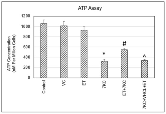 Quantification of ATP levels could serve as an endpoint functional assay to determine mitochondrial dysfunction. 7KC treatment resulted in a significant decrease in ATP levels. Incubation of cells with ET partially restored ATP levels, which were significantly greater than 7KC-treated cells. Pretreatment with VHCL abrogated the protective effect of ET (Figure 6).