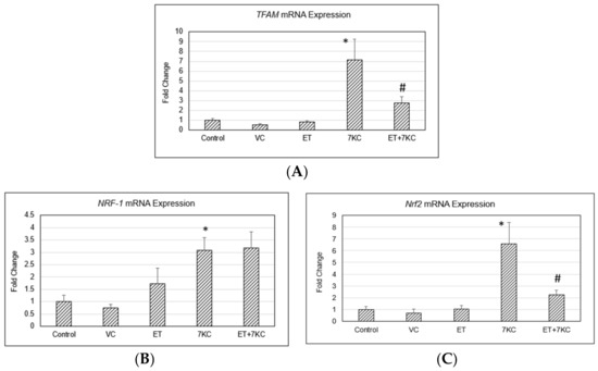 Mitochondrial transcription factor A (TFAM) is a nuclear-derived transcription factor involved in mitochondrial DNA maintenance that is inducible by mitochondrial nuclear respiratory factor 1 (NRF-1) transcription factor under stress [28,29]. Nuclear factor erythroid-derived 2-like 2 (Nrf2) is involved in cellular oxidative stress response and various protective mechanisms [30]. TFAM mRNA expression was induced by 7KC, but this increase was significantly reduced by ET (Figure 7A). As with TFAM, there was induction of NRF-1 (Figure 7B) and Nrf2 (Figure 7C), indicating an increased overall level of cellular stress after treatment of cells with 7KC. ET modulated the increased expression of Nrf2 but not that of NRF-1.