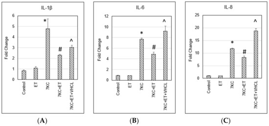 Inflammatory gene expression. 7KC induced increases in (A) IL-1β, (B) IL-6 and (C) 1L-8 and mRNA expression, and these increases were significantly reduced by ET. ET: 1 mM ET; VHCL: 100 μM VHCL; 7KC: 30 μM 7KC. Data are represented as the mean ± SD (n = 4). * Significant difference compared to controls (p < 0.05). # Significant difference compared to 7KC. ^ Significant difference compared to ET + 7KC. Data were analysed by one-way ANOVA with Bonferroni’s multiple comparison post-hoc test.
