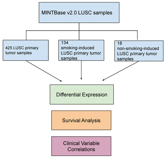 Schematic of project workflow. Transfer RNA-derived fragment (tRF) counts were extracted from MINTbase v2.0 (https://cm.jefferson.edu/tcga-mintmap-profiles/; accessed on 14 December 2022) for 425 lung squamous cell carcinoma (LUSC) primary tumor samples and 36 adjacent normal samples. We analyzed the data in three primary cohorts: (1) primary tumor samples (425 samples), (2) smoking-induced LUSC primary tumor samples (134 samples), and (3) non-smoking-induced LUSC primary tumor samples (18 samples). Adjacent normal LUSC samples were used as the control group. Differential expression analysis was performed to identify significantly differentially expressed tRFs in each of these cohorts (|log fold change (FC)| > 1 and p-value < 0.05). tRF correlations to patient survival outcomes and clinical variables were also performed to analyze the role of these tRFs in cancer onset and development (p-value < 0.05).