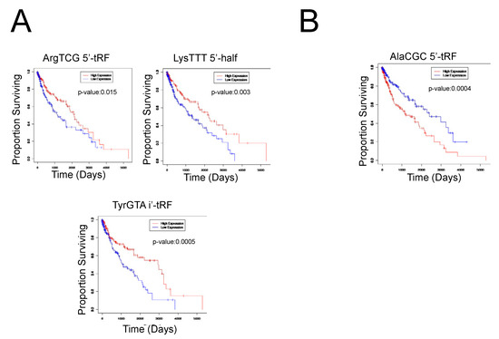 We next analyzed the correlations between tRF expression and patient survival outcomes using Kaplan–Meier survival analysis and plotted the results using Cox proportional hazards regression, with a p-value of 0.05 indicating a significant result. We found that 10 tRFs were significantly correlated to patient survival outcomes. Specifically, the upregulation of AlaCGC 5′-tRF was associated with worse patient survival outcomes, while the downregulation of TyrGTA i-tRF, GlyGCC i-tRF, LeuAAG 3′-tRF, LysTTT 5′-half, CysGCA 5′-tRF, TrpTCA 3′-tRF, ArgTCG 5′-tRF, and LeuTAA i′-tRF was associated with worse patient survival outcomes (Figure 2). Notably, ArgTCG 5′-tRF was both significantly differentially expressed in tumor samples and implicated in worse patient survival outcomes, suggesting its potential to act as a biomarker of worse clinical outcomes in LUSC (Figure 2). However, further studies are required to fully elucidate this finding.