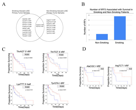 Differentially expressed tRFs and correlations to clinical variables in the smoking-induced LUSC primary tumor samples and non-smoking-induced LUSC primary tumor samples. Differential expression analysis and survival analysis were utilized to identify tRFs unique to smoking-induced LUSC primary tumor samples and non-smoking-induced LUSC primary tumor samples. Analyses were conducted separately for each of these cohorts. (A) Venn diagram comparing significantly differentially expressed tRFs in the smoking-induced LUSC primary tumor samples and non-smoking-induced LUSC primary tumor samples (p-value < 0.05). GlyGCC 5′-tRF and GlyTCC 3′-tRF were found to be differentially expressed in both smoking-induced LUSC and non-smoking-induced LUSC primary tumor samples. (B) Bar graph displaying the number of tRFs associated with survival in both smoking-induced LUSC and non-smoking-induced LUSC primary tumor samples. Specifically, a much larger number of tRFs were associated with smoking-induced LUSC primary tumor samples in comparison to non-smoking-induced LUSC primary tumor samples, demonstrating their potential to influence clinical outcomes. (C) Select survival plots demonstrating tRF correlations to patient survival in smoking-induced LUSC primary tumor samples. The red curve represents high expression of the tRF, while the blue curve represents low expression of the tRF. When the high expression curve is above the low expression curve in the graph, it demonstrates that the decreased expression of the tRF is correlated to worse patient survival outcomes. (D) Select survival plots demonstrating tRF correlations to patient survival in non-smoking-induced LUSC primary tumor samples.
