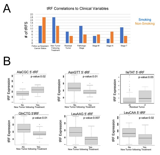 tRF correlations to clinical variables in smoking-induced LUSC and non-smoking-induced LUSC primary tumor samples. tRF correlations to clinical variables were performed using the Kruskal–Wallis test in the edgeR library (p-value < 0.05). Specifically, the following clinical variables were utilized for the purposes of this study: residual tumor, cancer pathologic stage, cancer pathologic TNM stage, cancer neoplasm status, new tumor event after treatment, and primary therapy outcome. (A) Bar graph representing the total number of tRFs associated with the seven clinical variables that displayed significant correlations to tRF expression. Orange represents non-smoking-induced LUSC primary tumor samples, while blue represents smoking-induced LUSC primary tumor samples. (B) Select box plots representing tRF correlations to clinical variables (p-value < 0.05). The x-axis represents a clinical variable, with specific subgroups for the variable, as noted in each graph. The y-axis represents tRF expression. Each box displays the maximum, minimum, median, lower quartile, and upper quartile of tRF expression for each condition. Specifically, by comparing the median tRF expression value between groups, we can draw conclusions regarding the role of tRFs in carcinogenesis and treatment response.