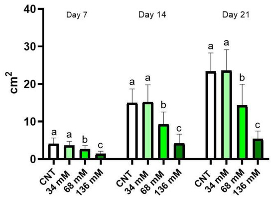 Aerial part surface of E. sativa plants grown under different saline conditions: Control (CNT), and 34, 68, and 136 mM NaCl. The graph shows the parameter measured after 7, 14, and 21 days from the beginning of the treatment. Different letters mean a statistical difference between the groups (p < 0.05).
