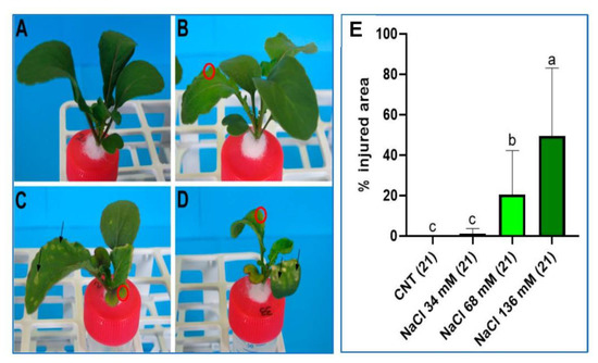 Images of the plants of the (A) control, (B) 34 mM NaCl, (C) 68 mM NaCl, and (D) 136 mM NaCl groups after 21 days of treatment. Black arrows show necrotic areas. Red circles indicate examples of chlorosis-affected zones. (E) Percentage of the plant shoot area affected by salt injuries in all four groups after 21 days of treatment. Different letters indicate a significant difference between the groups (p < 0.05).