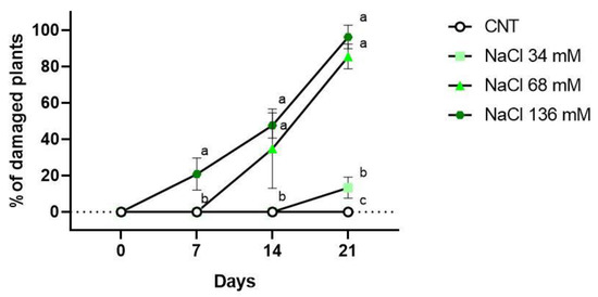 At the end of the experiment (21 days), symptoms were observed for all the groups of plants subjected to the various salt treatments, as reported in Figure 3. The 34 mM NaCl group had 13% of plants with symptoms, but there was no statistical difference compared to the control group. However, the 68 and 136 mM NaCl groups showed salt injuries on 86% and 96% of the plant shoots, respectively.