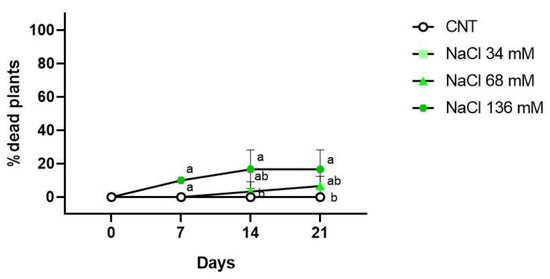 Percentage of dead plants in the control (CNT), and 34, 68 , and 136 mM NaCl groups after 7, 14, and 21 days of treatment. Different letters mean statistical difference between the groups (p < 0.05).