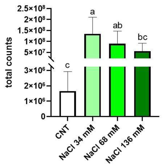 Total glucosinolate concentration in the control group (CNT) compared to the treated groups (36, 68, and 136 mM NaCl). Total counts refer to the sum of the peak areas of glucosinolates in LC–HRMS analysis. Different letters mean statistical difference between the groups (p < 0.05).