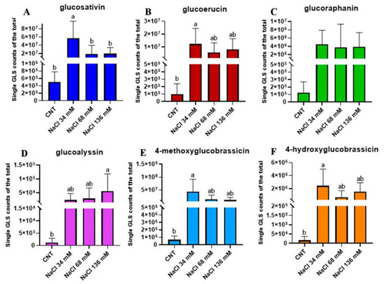 Proportional counts of single GLS: (A) glucosativin (dark blue), (B) glucoerucin (wine), (C) glucoraphanin (green), (D) glucoalyssin (violet), (E) 4-methoxyglucobrassicin (light blue), and (F) 4-hydroxyglucobrassicin (orange) over the total identified with LC–HRMS in the controls compared with the treated groups: 34, 68, and 136 mM NaCl. The percentage was relative to the integration of the peak area and was calculated with respect to the sum of all the peaks. The relative percentages are thus approximate, and the analysis was only a relative quantitation. Different letters mean statistical difference between the groups (p < 0.05).