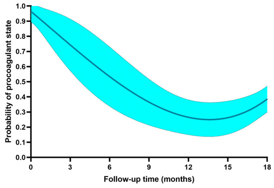 Probability of the persistence of a procoagulant state. Cubic regression function with 95% confidence interval bands.