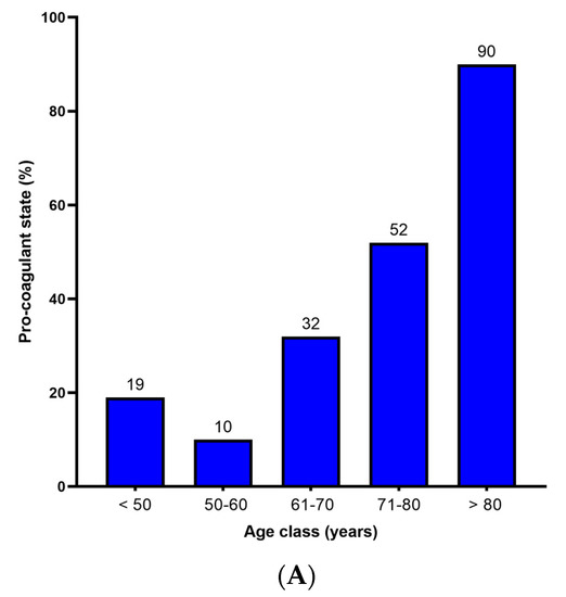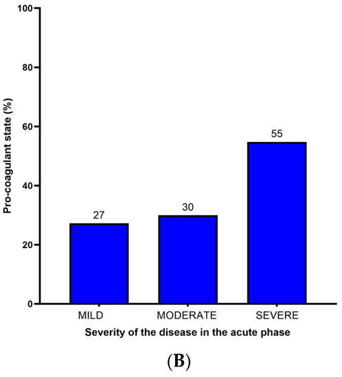 Rate of procoagulant state persistence based on the age at acute phase stage (Panel (A)) and severity of the acute phase disease (Panel (B)).