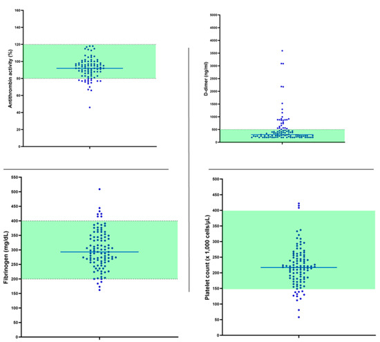 Standard laboratory assessment included coagulation tests (activated Partial Thrombin Time, aPTT, seconds; international normalized ratio, INR; fibrinogen, mg/dL; D-dimer, ng/mL; antithrombin activity, %) and platelet count (cells/µL).