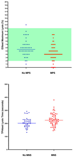 Individual and mean values of fibrinolysis according to the presence of major physical symptoms (MPS) and major neurological symptoms (MNS). Green area is the normality range. No defined normal range exists for TPAtest.