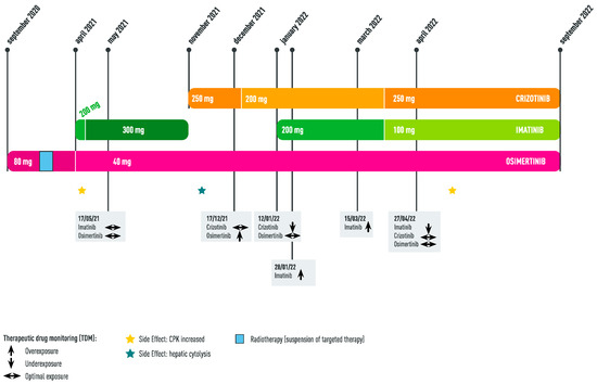 Abnormal activation of tyrosine kinases due to mutations, translocation, or amplification is involved in tumorogenesis, cancer cell proliferation, and metastasis [1]. As such, tyrosine kinases have emerged as major targets for drug discovery. Tyrosine kinase inhibitors (TKIs) have played an important role in improving the survival of patients with tumors. Imatinib was the first TKI to receive FDA approval in 2001 for the treatment of chronic myelogenous leukemia. It has subsequently been extended for the treatment of malignant metastatic and/or unresectable gastrointestinal stromal tumors (GIST) [2]. Multiple targets have emerged over the last twenty years contributing to the significant progress in cancer treatment [3]. Numerous driver mutations have been identified in non-small cell lung cancer (NSCLC) and are targetable by TKIs [4]. Epidermal growth factor receptor (EGFR) activating mutations occur in 10–15% of patients with NSCLC. Osimertinib, a third-generation EGFR TKI, is currently recommended in first metastatic line for patients with an EGFR-mutated (deletion exon 19 or L858R mutation in exon 21) NSCLC [5]. MET amplification represents the main mechanism of acquired resistance to osimertinib (10–15% of cases) [6,7]. Clinical trials are currently underway to find effective strategies in this setting (NCT05015608/NCT03940703). Several drug associations of anti-EGFR and anti-MET show promising results for these patients [8,9]. Unfortunately, history of a second active cancer within 5 years of screening is an exclusion criteria for almost all clinical trials. For patients with a second cancer, crizotinib, an FDA-approved TKI in patients treated for an NSCLC with ALK or ROS-1 translocation, is also active against MET-amplification. It is an off-label treatment option for patients not suitable for clinical trials developing a MET amplification under osimertinib [10,11]. TKI combination allows for bypassing resistance mechanisms but exposes the patient to major risk of toxicity or drug–drug interactions (between TKIs or co-treatment). In addition, the dose of TKIs needs to be adjusted frequently in case of adverse events. Therapeutic drug monitoring (TDM) is a biological monitoring tool to compare plasma concentration of each TKI with international target concentration guidelines in order to enhance the efficacy and safety of these combinations. Dose adjustment only on toxicity occurrence is no longer relevant in oncology. TKI dosage can be optimized with TDM to avoid under/over-exposition of TKI in a prospective way [12]. We report here the case of a patient with two active cancers: a GIST treated with imatinib and an EGFR-mutated NSCLC that developed a MET amplification during osimertinib treatment. We used a combination of three TKIs (imatinib, osimertinib, and crizotinib) to treat both diseases. We report here the use of therapeutic drug monitoring to adapt the dose of each TKI in order to limit the risk of toxicity while ensuring optimal anti-tumor efficacy.