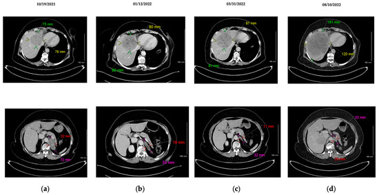 Hepatic (top) and adrenal (bottom) CT-scan illustrating tumoral evolution with combination of tyrosine kinase inhibitors. (a) Baseline with osimertinib + crizotinib combination; (b) After 3 months with osimertinib + crizotinib; adrenal partial response; non-significant trend in hepatic progression; introduction of imatinib; (c) Stable disease after 3 months of tritherapy (osimertinib + crizotinib + imatinib); non-significant trend in hepatic progression; (d) Hepatic and adrenal progression after 7 months of tritherapy.